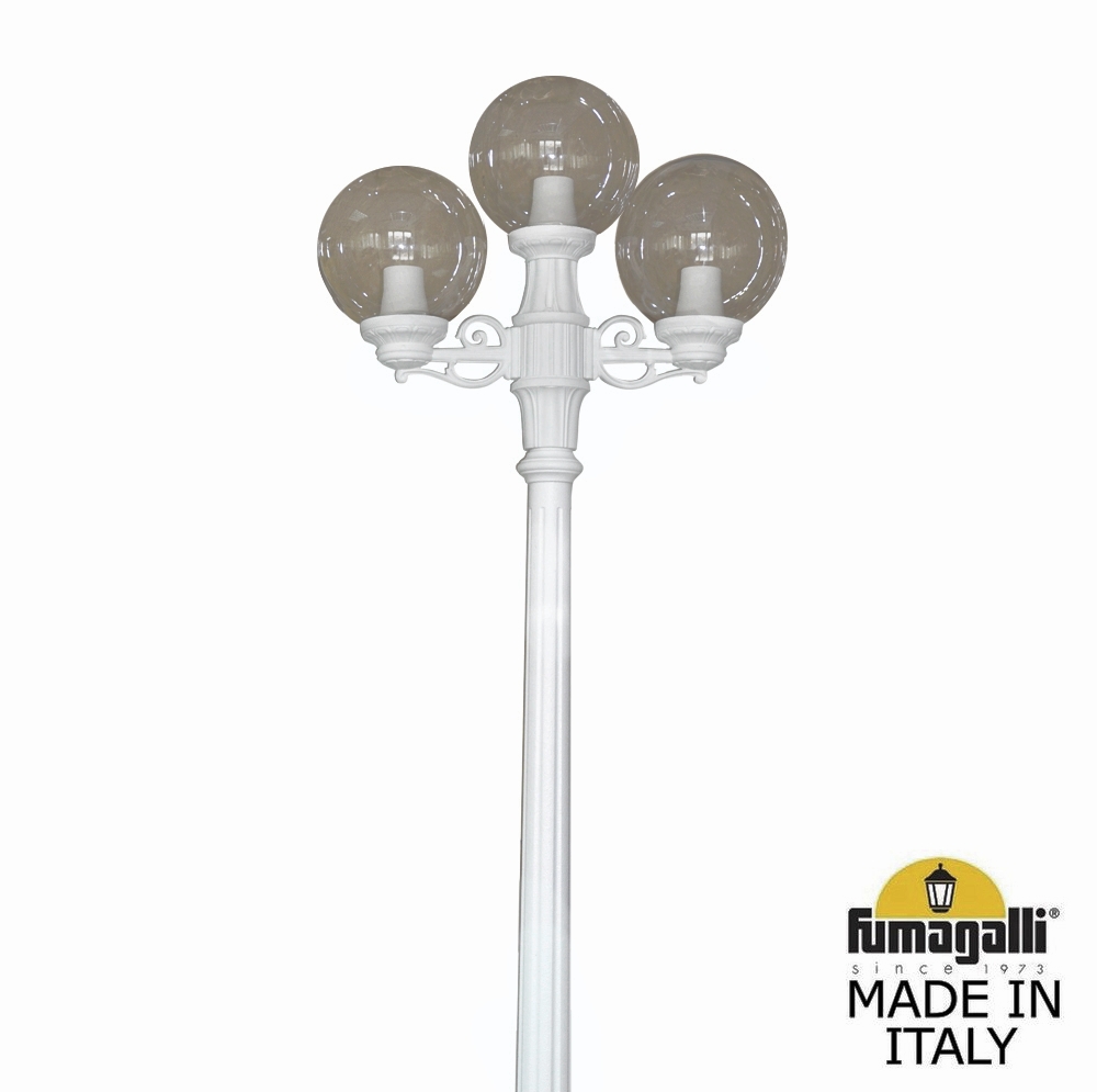 Садово-парковый фонарь FUMAGALLI серии GLOBE 250, модель GLOBE 250/RICU/BISSO 2L+1. Парковый торшер, столб RICU с двумя уличными фонарями - шарами GLOBE 250 на малых консолях BISSO смонтированными "вверх" и одним светильником - шаром по центру опоры освещения. Используются для архитектурного и ландшафтного освещения в стиле "классика". Место установки столбиков освещения - парковые дорожки, cкверы, садовые участки, тротуары, а так же ландшафтные и архитектурные объекты. Изготовлены в Италии, по уникальным технологиям "FUMAGALLI" из современного композитного полимера RESIN. Этот материал в 5 раз прочнее металла, не ржавеет, не окисляется, не выгорает на солнце, его не нужно красить. Все светильники пыле-влаго защищены по стандарту IP55 (Пыленепроницаемые, защита от водяных струй с любого направления). В комплекте идут крепежи и закладные элементы. Рассеиватель выполнен из антивандального, не мутнеющего и не горючего PMMA (ПолиМетилМетаАкрилат). Срок службы светильника - не менее 20 лет. Температура использования от -60 до +90. В серии GLOBE 250 есть фонари в настенном (BISSO/GLOBE 250, OFIR/GLOBE 250, MIRRA/GLOBE 250, PORPORA/GLOBE 250) подвесном (SICHEM/GLOBE 250) и наземном исполнении (IAFAET.R/GLOBE 250, ALOE.R/GLOBE 250, ARTU/GLOBE 250, GIGI/GLOBE 250, RICU/GLOBE 250, RICU/ISSO/GLOBE 250 1L, RICU/ISSO/GLOBE 250 2L, RICU/ISSO/GLOBE 250 3L) со столбами разной высоты, с разным количеством и конфигурацией голов. Консоли настенных фонарей и кронштейны светильников на столбах освщения могут устанавливаться вверх/вниз. Столбы выше 150 см имеют в основе мощную стальную трубу с двойной оцинковкой. При заказе требуется выбрать цвет корпуса, цвет плафона и тип патрона. По стилю и дизайну серия уличных светильников GLOBE 250 похожа на светильники большого размера GLOBE 400 и на светильники среднего размера GLOBE 300.