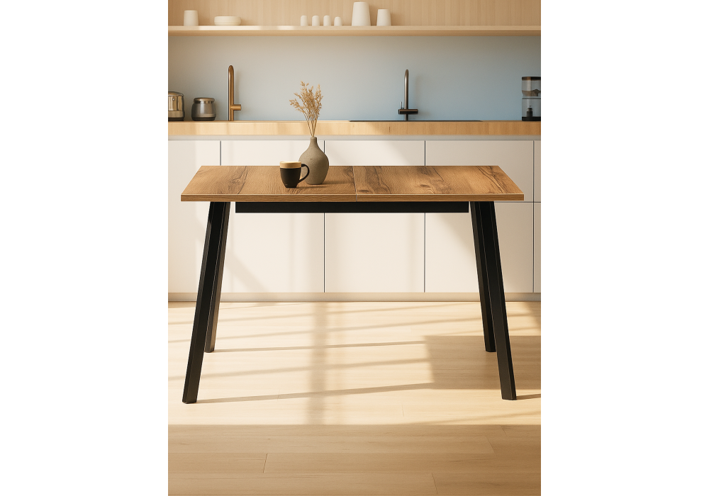 Толщина столешницы: 25 мм. Материал каркаса - металл; Материал столешницы - ЛДСП; Цвет ножек - черный; Цвет столешницы - дуб делано темный; Ширина - 75; Высота - 75; Длина стола в разложенном виде - 160; Длина - 120;