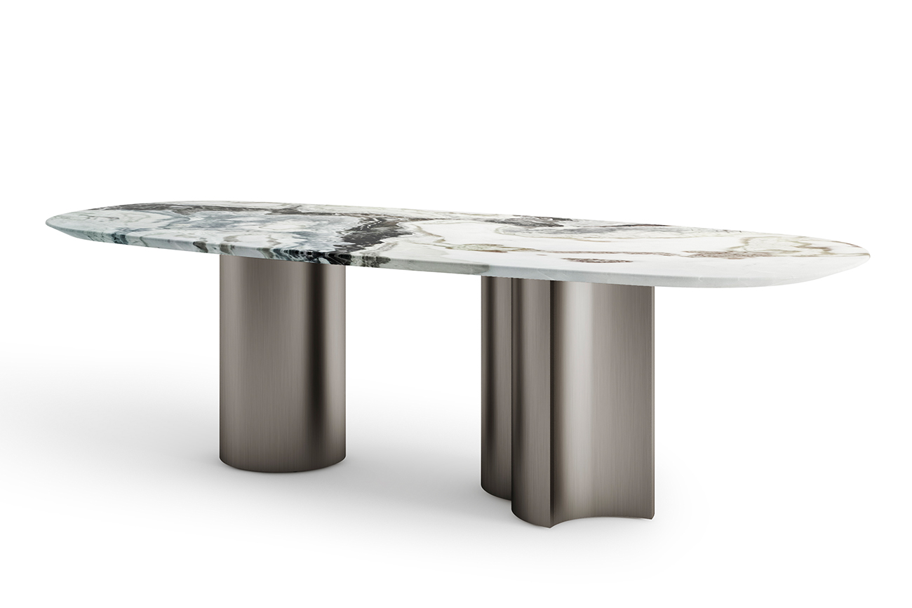 Обеденный стол с мраморной столешницей выглядит фундаментально и массивно за счет основания в виде колонн из нержавеющей стали. Такое стилистическое решение добавляет мебели не только устойчивости и надежности в эксплуатации, но и подчеркивает ее индивиду...