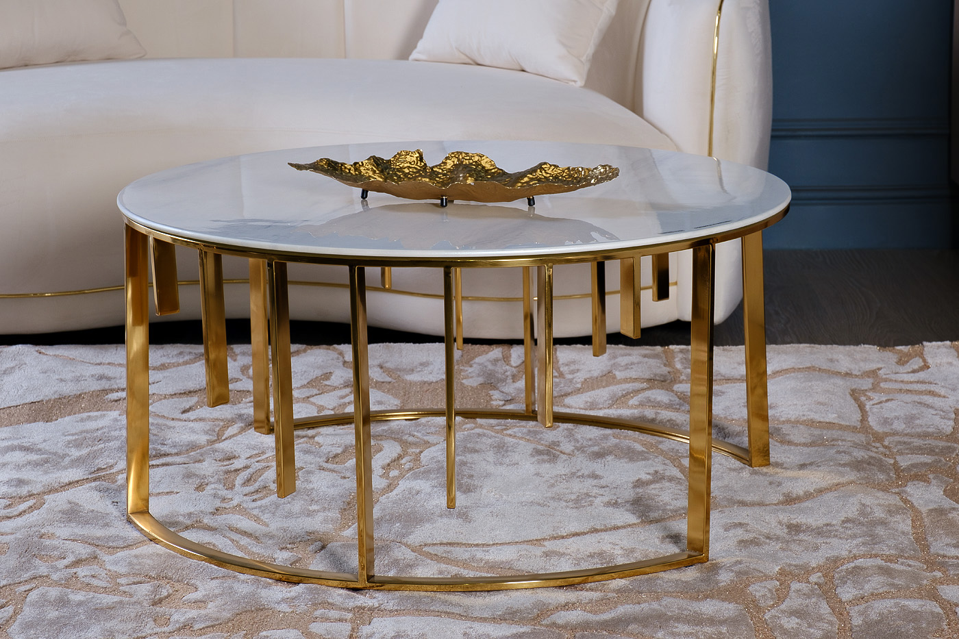 Круглый журнальный стол со светлой столешницей с имитацией под мрамор из закаленного стекла и оригинальным основанием из позолоченной нержавеющей стали. Он станет эффектным акцентом интерьера и составит стильную компанию мягкой мебели в гостиной, рабочем кабинете, холле. Журнальный стол из стекла с эффектом мрамора выглядит интересно за счет основы необычной формы. Именно она придает мебели визуальной легкости и элегантности. На столешнице из стекла красиво смотрятся кашпо и вазы с цветами, фигурки, сувениры, подсвечники, фоторамки и другой интерьерный декор. Garda Decor предлагает купить дизайнерский журнальный стол с доставкой, а также широкий выбор мебели и декора в современном дизайне.