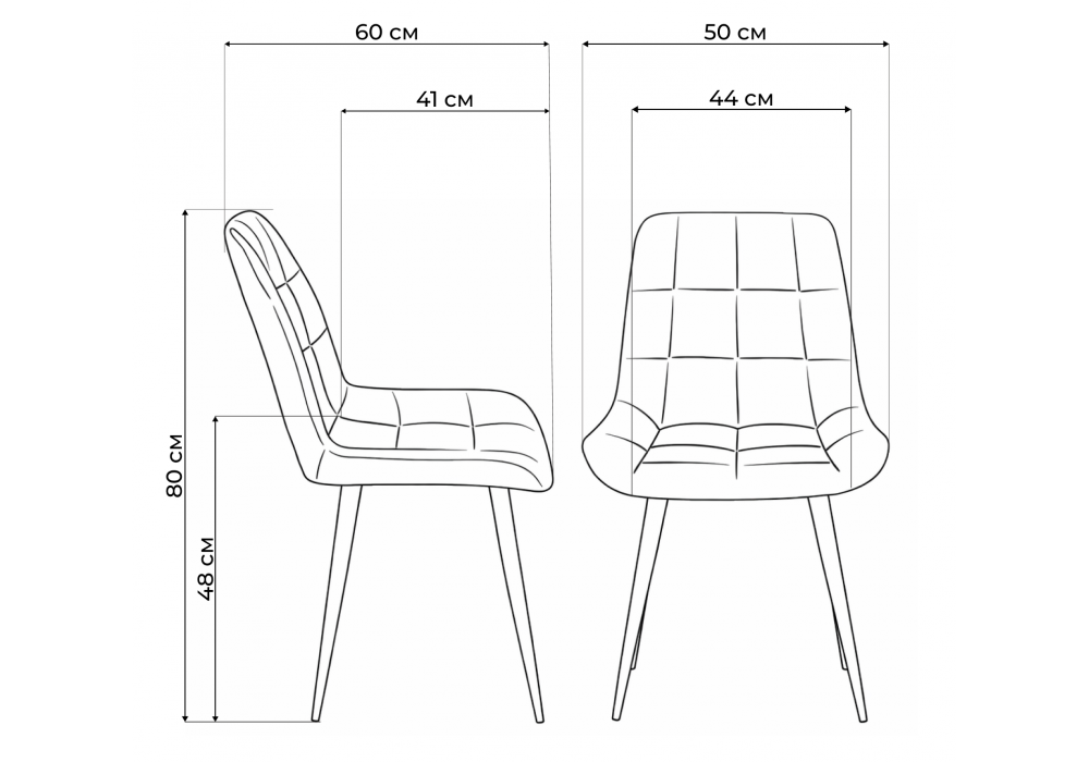 Материал каркаса - металл; Материал сиденья - велюр; Материал обивки - велюр; Цвет ножек - белый; Ширина - 50; Глубина - 60; Высота - 80; Ширина сиденья - 44; Глубина сиденья - 41; Высота сиденья - 48;