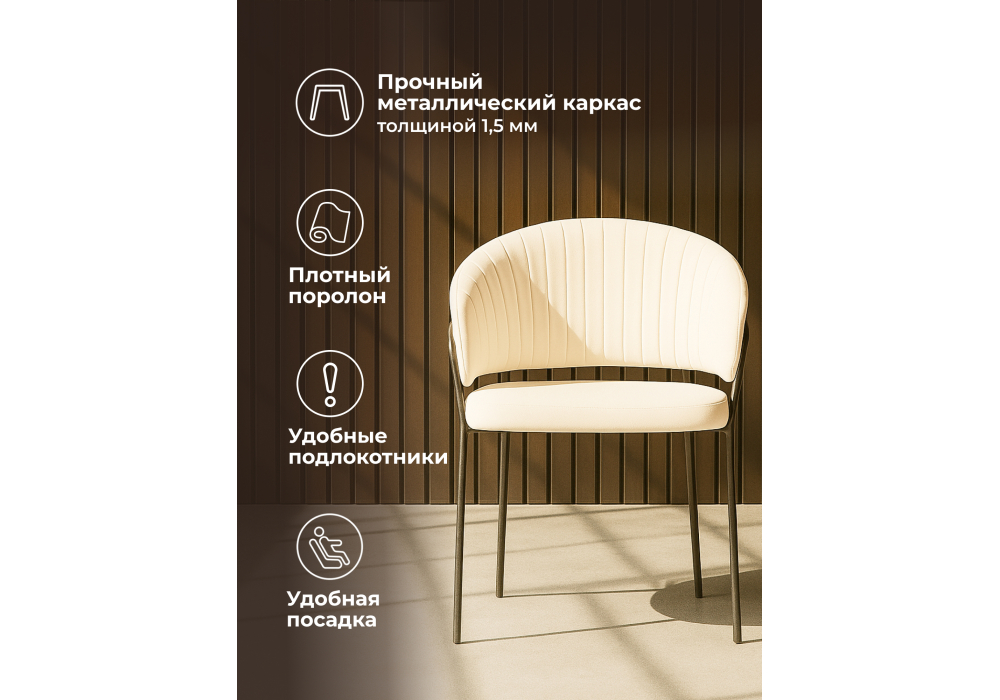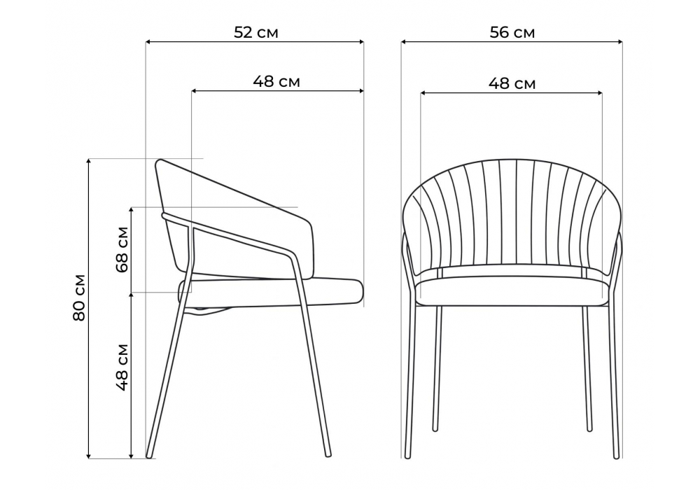 Высота подлокотников: 68 см. Материал каркаса - металл; Материал сиденья - велюр; Материал обивки - велюр; Цвет ножек - черный; Ширина - 56; Глубина - 52; Высота - 80; Ширина сиденья - 48; Глубина сиденья - 48; Высота сиденья - 48;