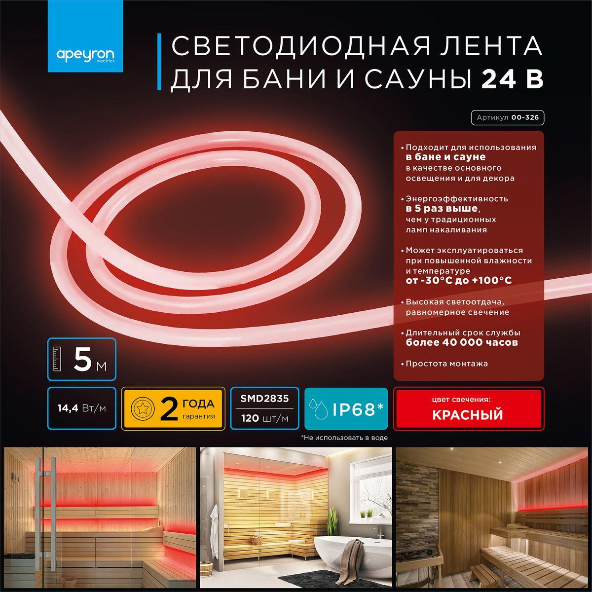 Влагозащищенная лента Apeyron 14, 4W/m 120LED/m 2835SMD красный 5M 00-326 в Зеленодольске
