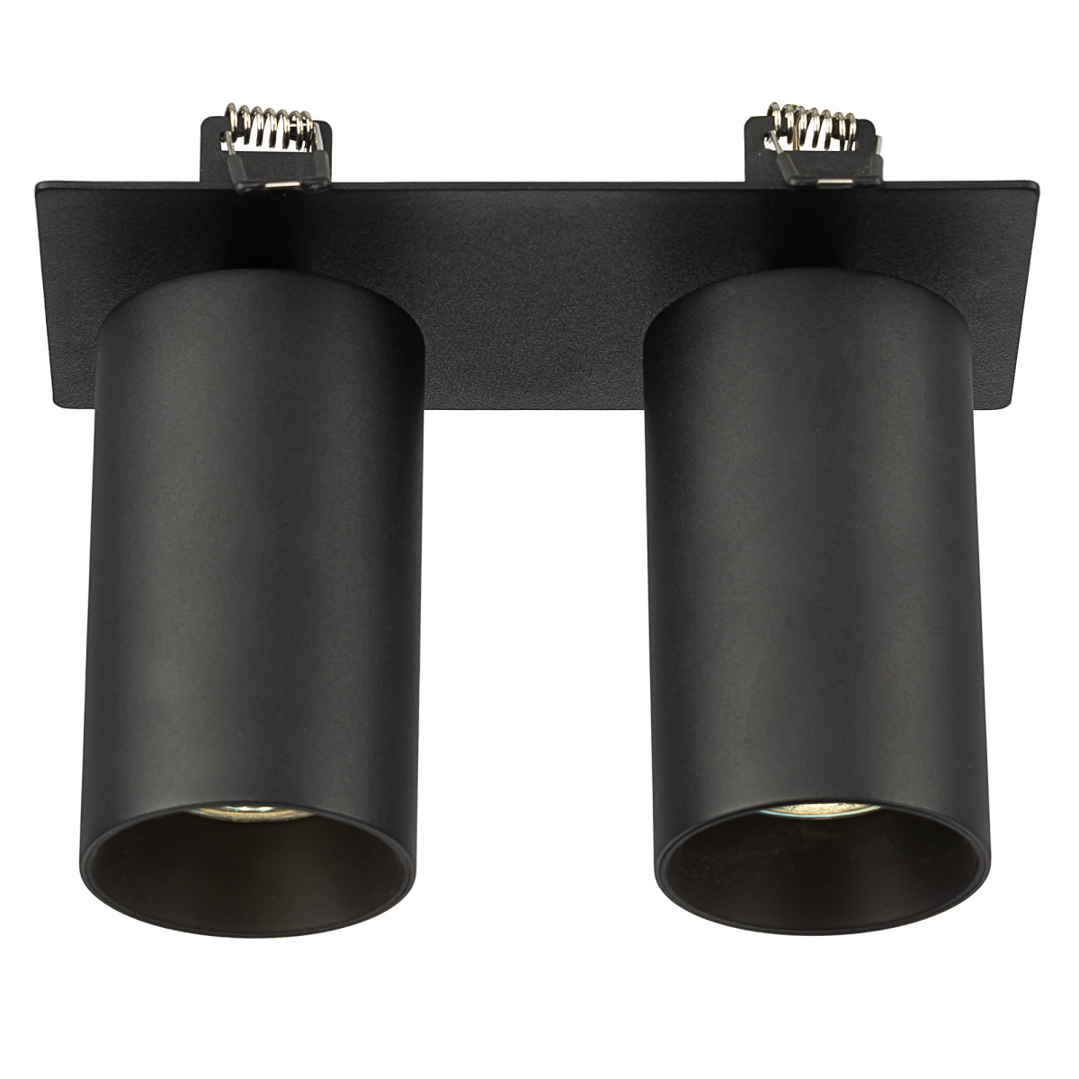 Корпус модели металлический, стильного черного оттенка. Плафоны цилиндрической формы имеют поворотное крепление, позволяющее менять направление светового луча. Источником света служат две светодиодные лампочки с цоколем GU10 мощностью не более 10Вт, встраиваемый тип крепления. Плафоны вращаются независимо друг от друга, что дает возможность формировать разный рисунок света.