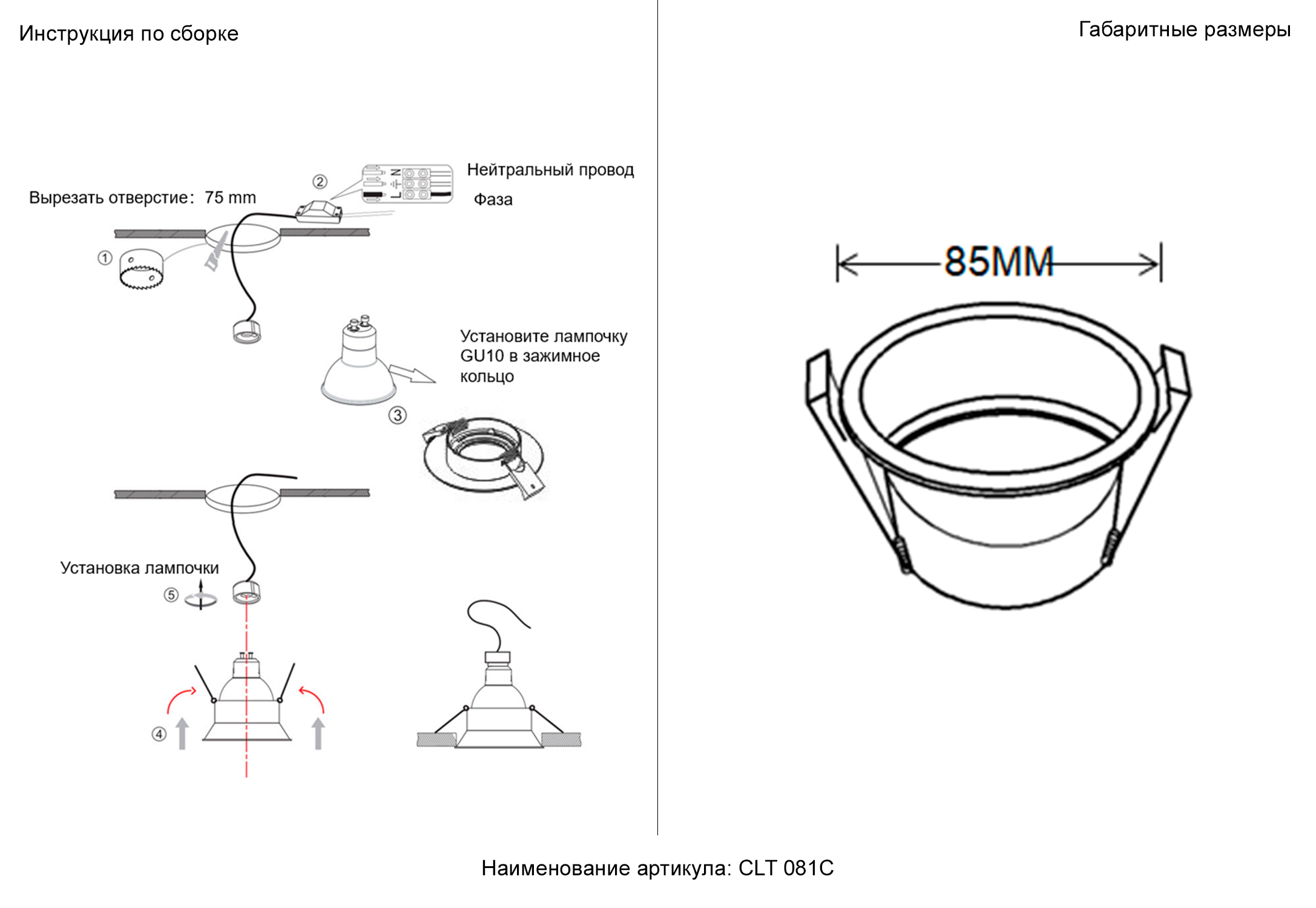 - Диаметр врезного отверстия: 75 мм (7.5 см)